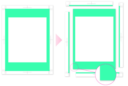 そこで、仕上がりサイズより大きめの裁ち落としを作り、多少のズレがあっても白い隙間が出ないようにする、というわけです。